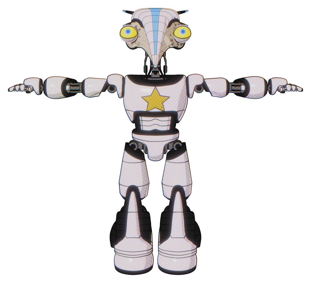 Automaton containing bird skull head and big yellow eyes and head shield design and light chest exoshielding and yellow star and light leg exoshielding and stomper foot mod. White halftone toon.