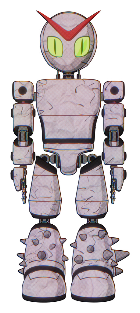 Automaton containing grey alien style head and cat's eyes and light chest exoshielding and prototype exoplate chest and light leg exoshielding and spike foot mod. Sketch pad doodle lines. Front view.