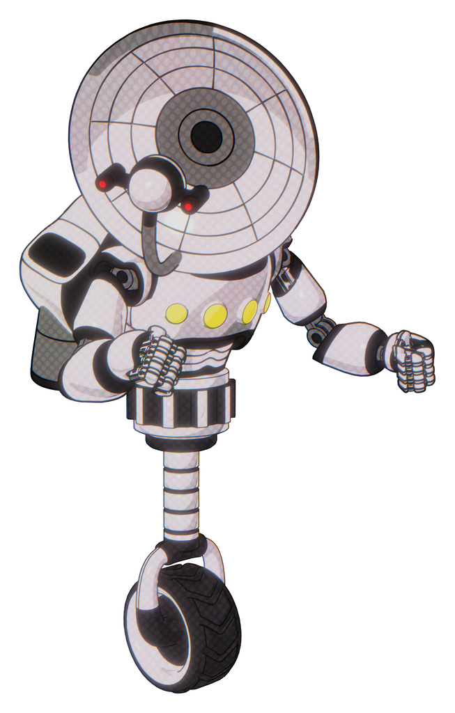 Robot containing dual retro camera head and satellite dish head and light chest exoshielding and yellow chest lights and rocket pack and unicycle wheel. White halftone toon. Fight or defense pose..