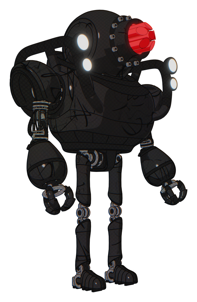 Bot containing round head and red laser crystal array and heavy upper chest and shoulder headlights and ultralight foot exosuit. Toon black scribbles sketch. Facing left view.
