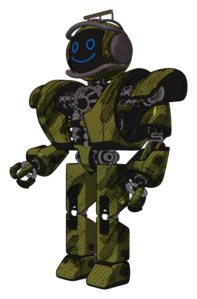 Mech containing digital display head and happy face and led and protection bars and heavy upper chest and heavy mech chest and prototype exoplate legs. Grunge army green. Facing right view.