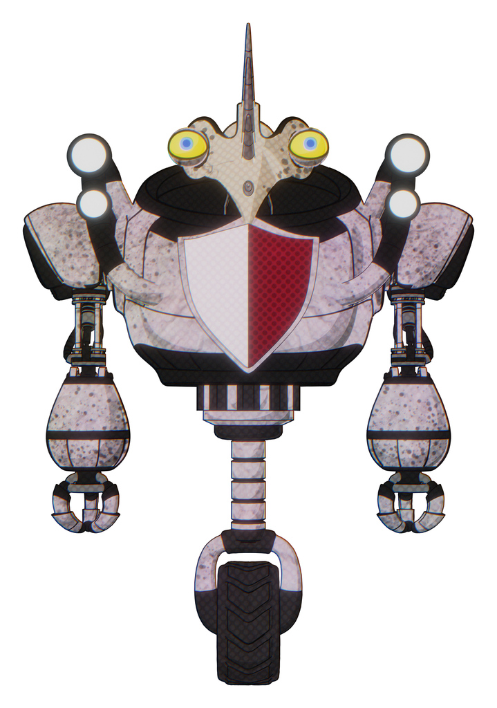 Bot containing bird skull head and big yellow eyes and heavy upper chest and red shield defense design and shoulder headlights and unicycle wheel. Sketch pad dirty smudge. Front view.