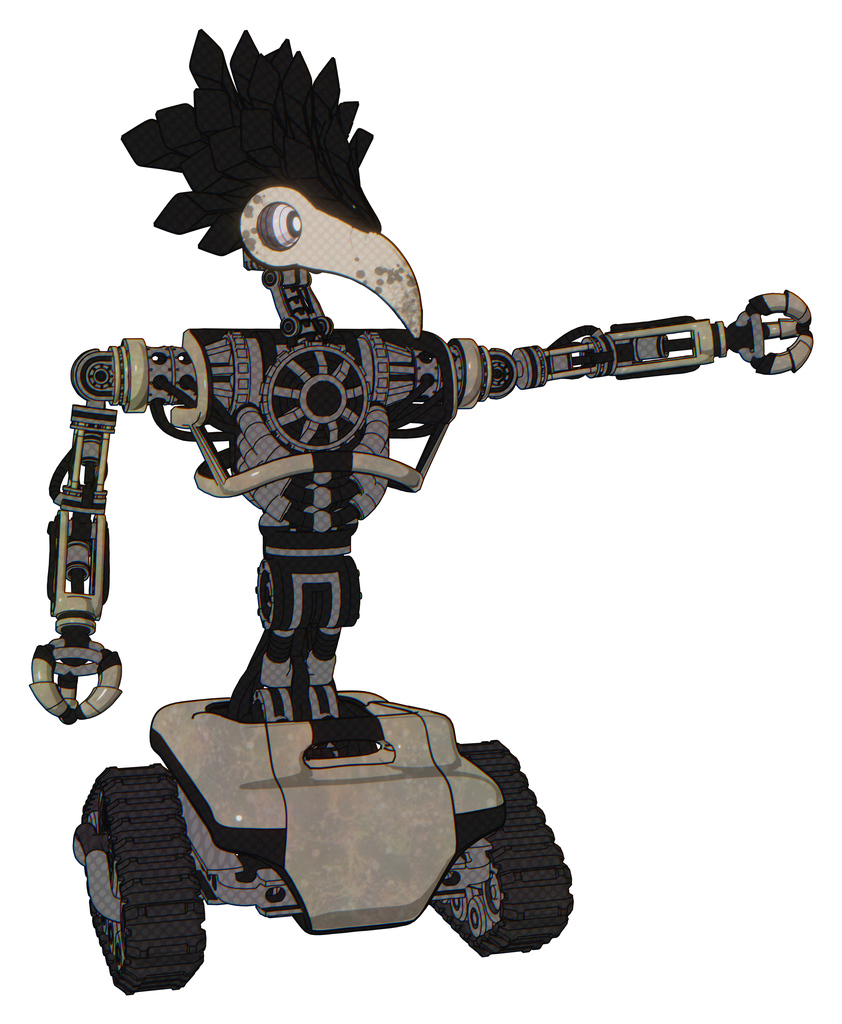 Cyborg containing bird skull head and white eyeballs and crow feather design and heavy upper chest and no chest plating and tank tracks. Grungy fiberglass. Pointing left or pushing a button..
