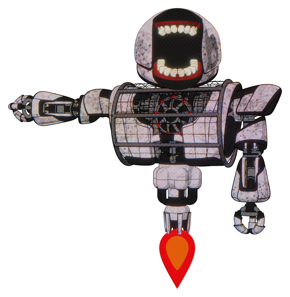 Robot containing chomper head design and heavy upper chest and heavy mech chest and barbed wire chest armor cage and jet propulsion. Sketch pad dirty smudge. Arm out holding invisible object..