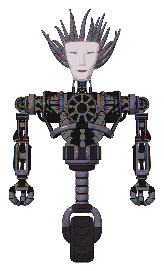 Cyborg containing humanoid face mask and heavy upper chest and no chest plating and unicycle wheel. Light lavender metal. Front view.