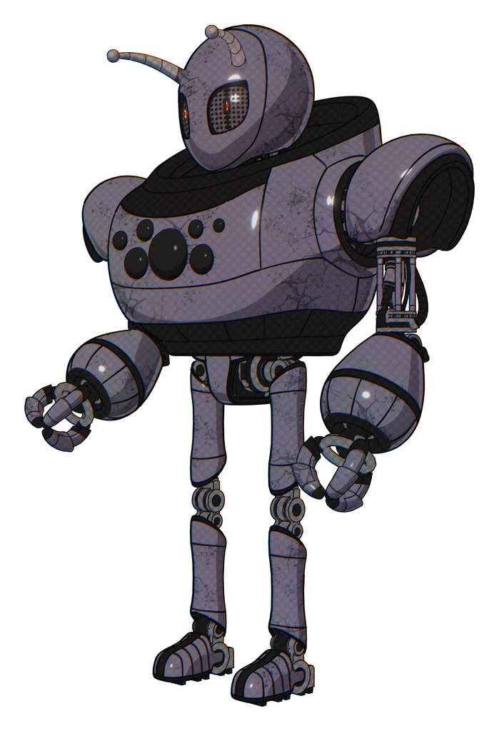 Droid containing grey alien style head and metal grate eyes and bug antennas and heavy upper chest and chest compound eyes and ultralight foot exosuit. Light lavender metal. Facing right view.