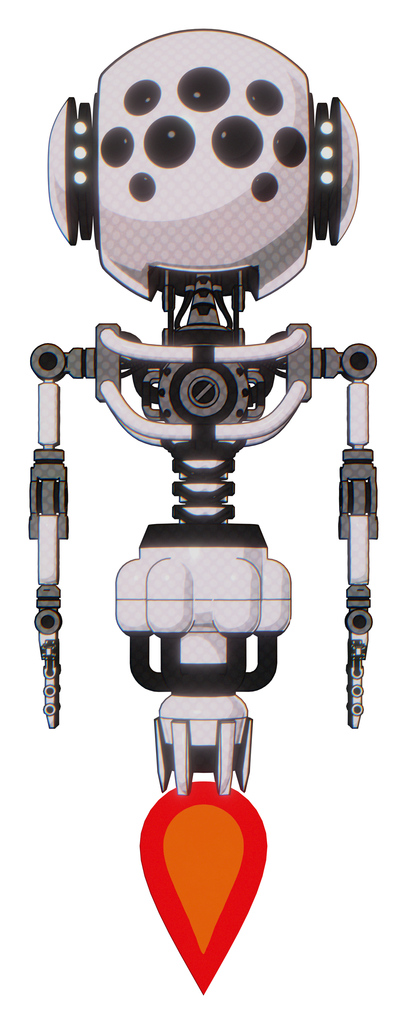 Mech containing round head and bug eye array and head light gadgets and light chest exoshielding and no chest plating and jet propulsion. White halftone toon. Front view.