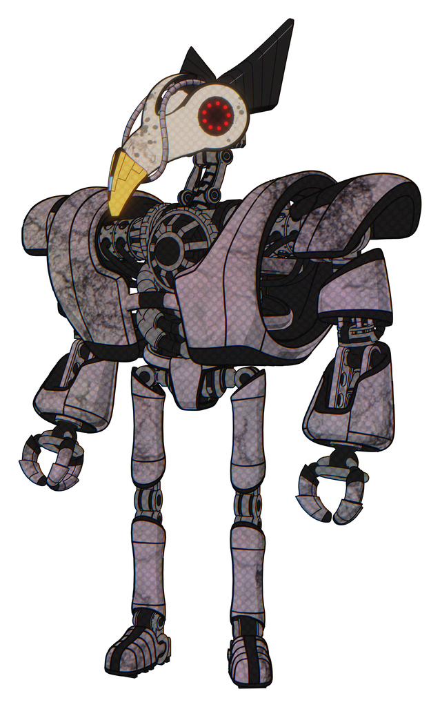 Automaton containing bird skull head and red led circle eyes and robobeak design and heavy upper chest and heavy mech chest and ultralight foot exosuit. Dark dirty scrawl sketch.