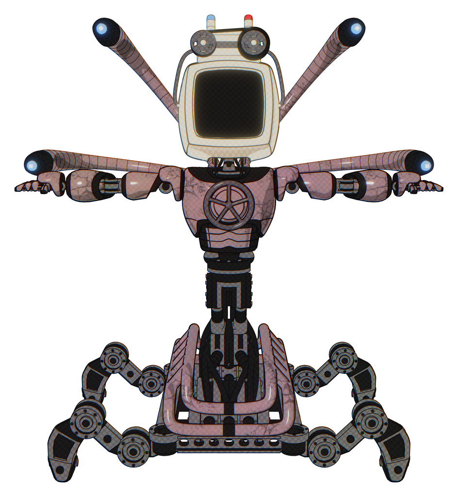 Cyborg containing old computer monitor and old computer magnetic tape and light chest exoshielding and chest valve crank and blue-eye cam cable tentacles and insect walker legs. Grayish pink. T-pose.