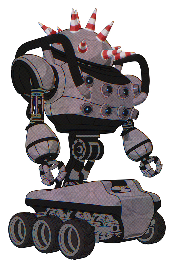 Mech containing red and white cone dome head and heavy upper chest and chest energy sockets and six-wheeler base. Dark sketch. Facing left view.