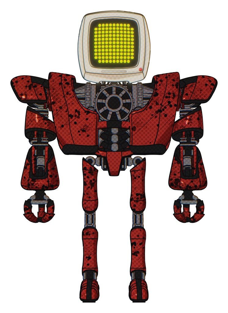Cyborg containing old computer monitor and yellow circle array display and heavy upper chest and heavy mech chest and ultralight foot exosuit. Grunge dots cherry tomato red. Front view.