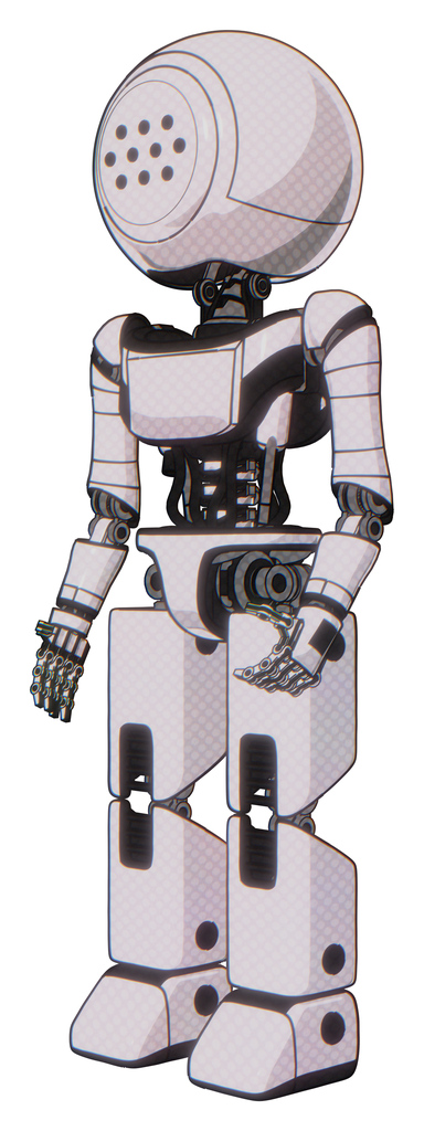 Automaton containing dots array face and light chest exoshielding and ultralight chest exosuit and prototype exoplate legs. White halftone toon. Facing right view.