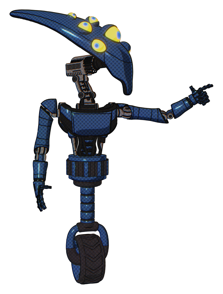 Robot containing flat elongated skull head and yellow eyeball array and light chest exoshielding and ultralight chest exosuit and unicycle wheel. Dark blue halftone.
