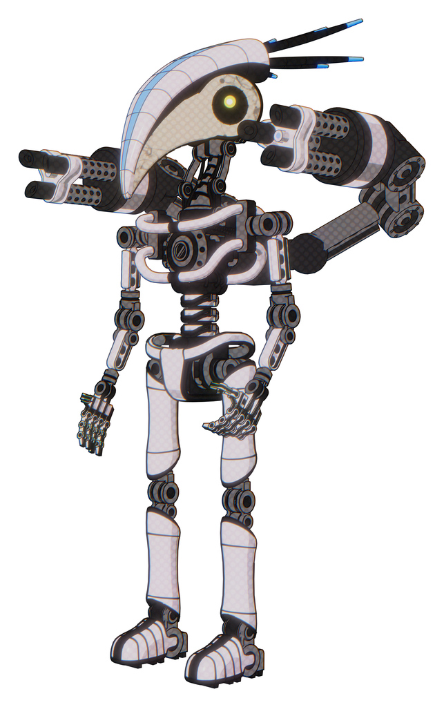 Bot containing bird skull head and yellow led protruding eyes and head shield design and light chest exoshielding and minigun back assembly and no chest plating and ultralight foot exosuit.