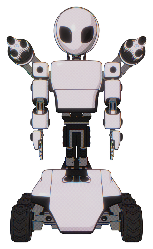 Mech containing grey alien style head and black eyes and light chest exoshielding and prototype exoplate chest and minigun back assembly and six-wheeler base. White halftone toon. Front view.