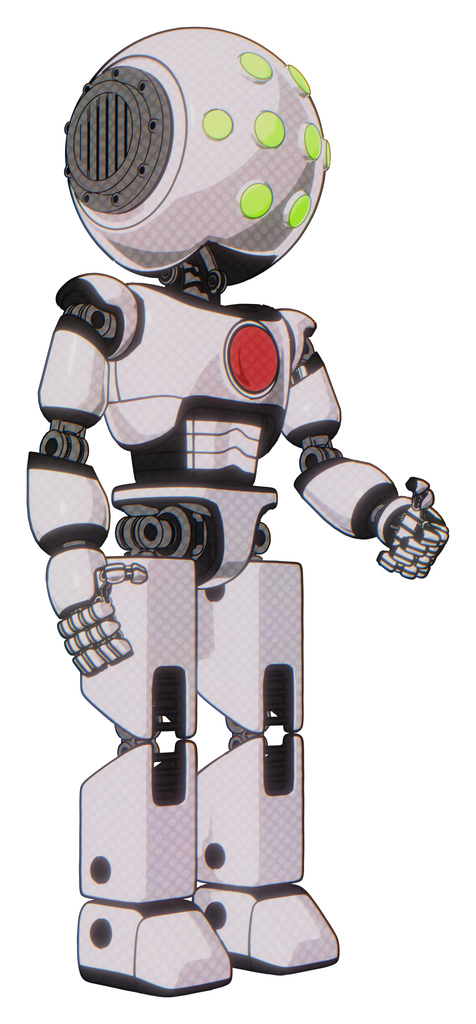 Cyborg containing round head and green eyes array and light chest exoshielding and red chest button and prototype exoplate legs. White halftone toon. Facing left view.
