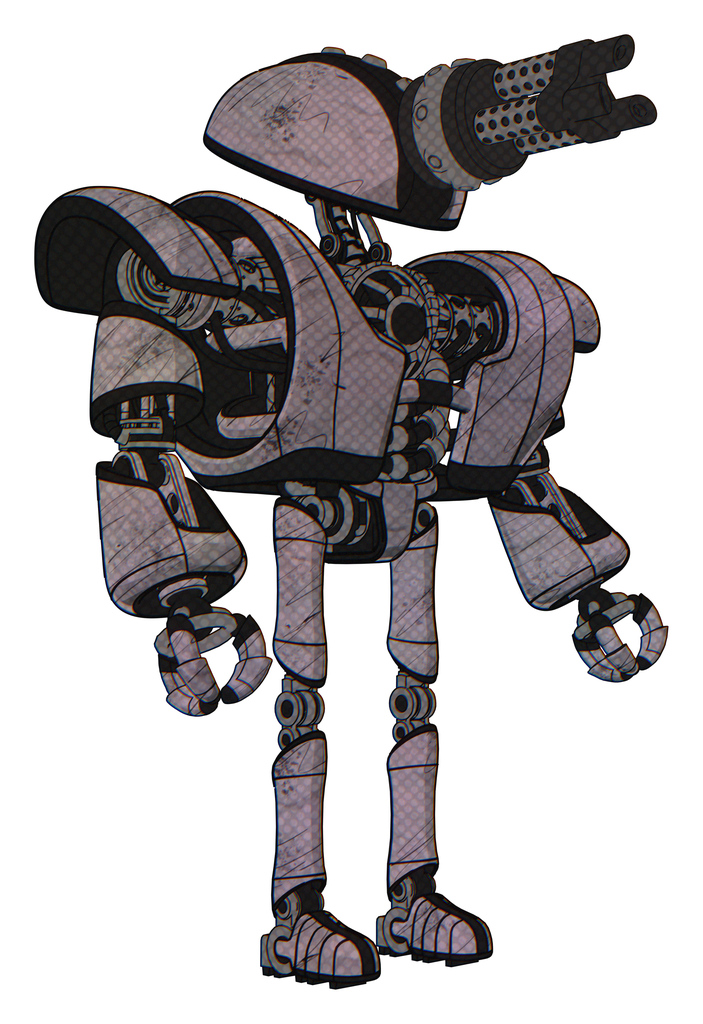 Automaton containing gatling gun face design and heavy upper chest and heavy mech chest and ultralight foot exosuit. Sketch fast lines. Facing left view.
