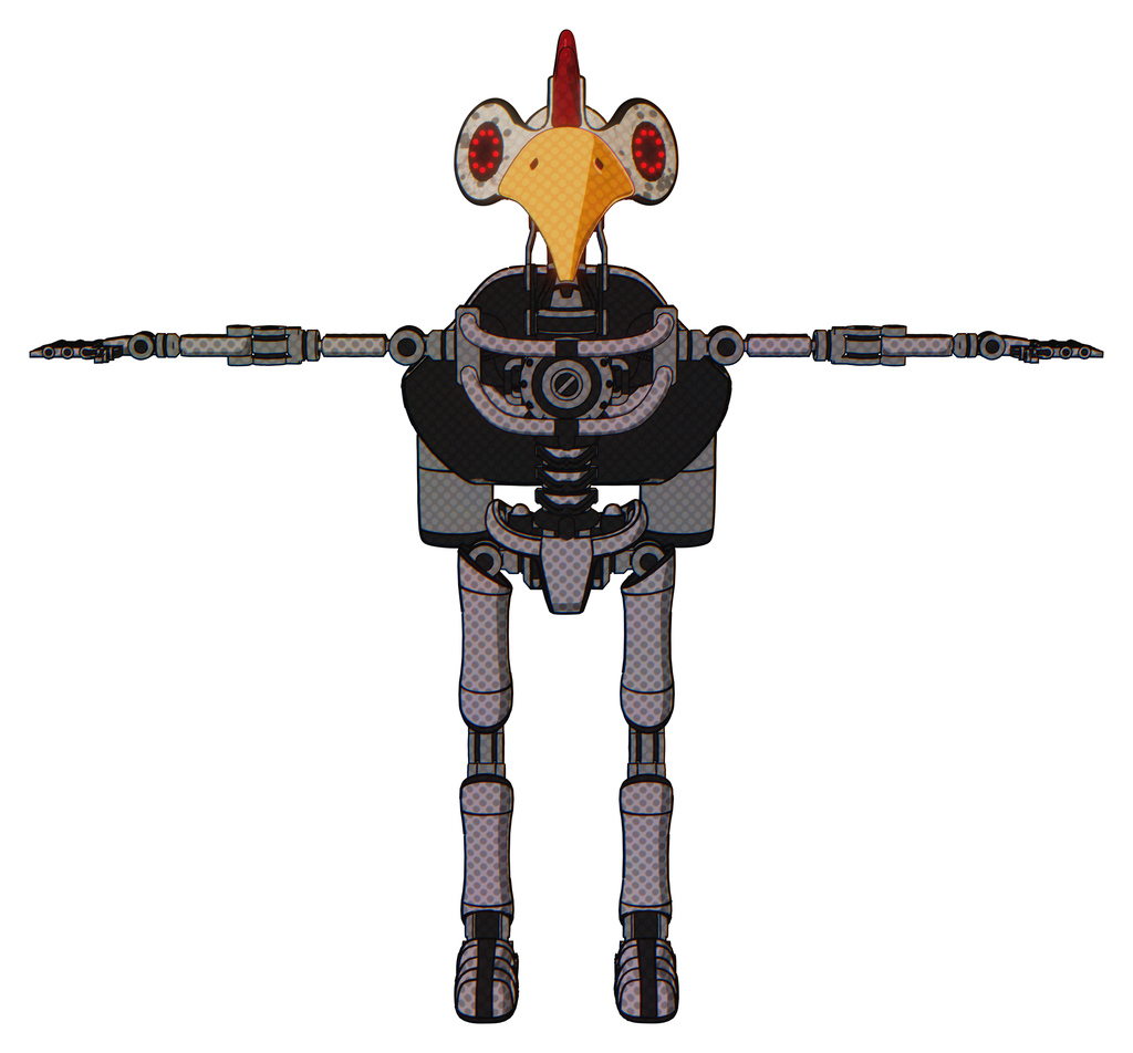 Mech containing bird skull head and red led circle eyes and chicken design and light chest exoshielding and rocket pack and no chest plating and ultralight foot exosuit. Halftone gray. T-pose.