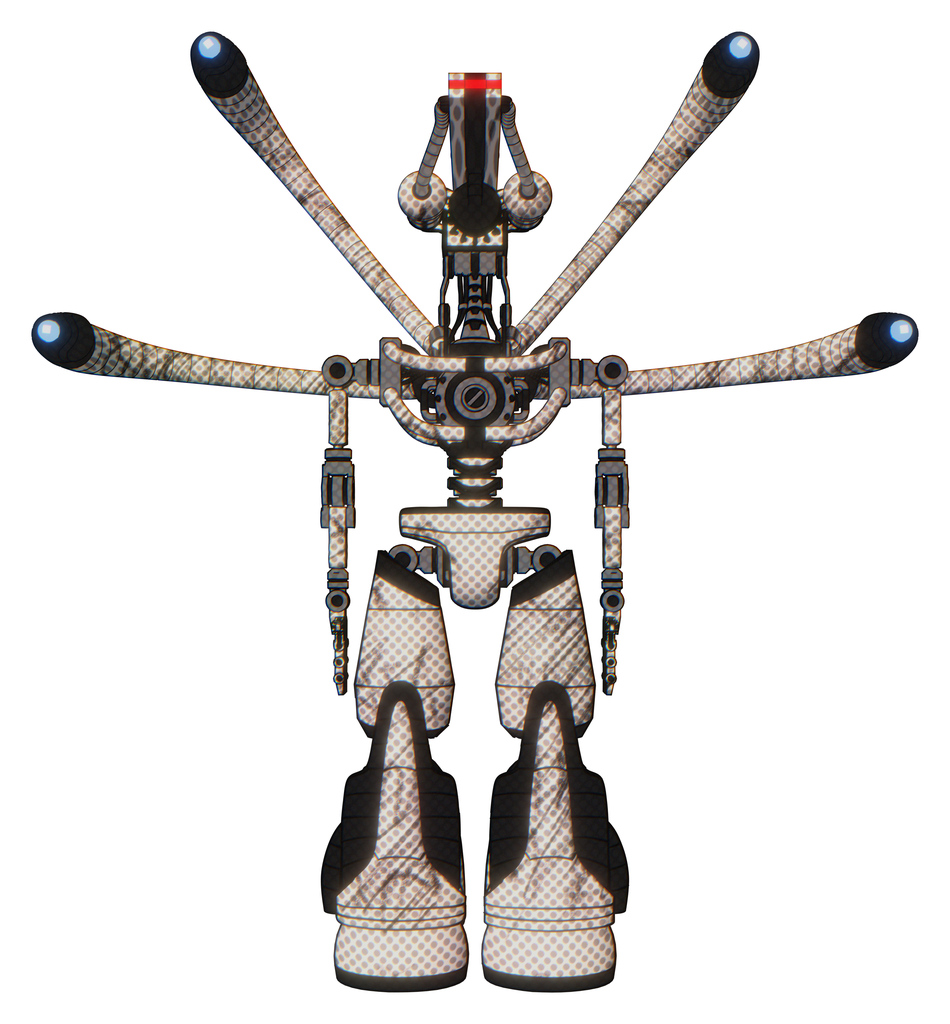 Robot containing elements: dual retro camera head, laser gun head, light chest exoshielding, blue-eye cam cable tentacles, no chest plating, light leg exoshielding, stomper foot mod.