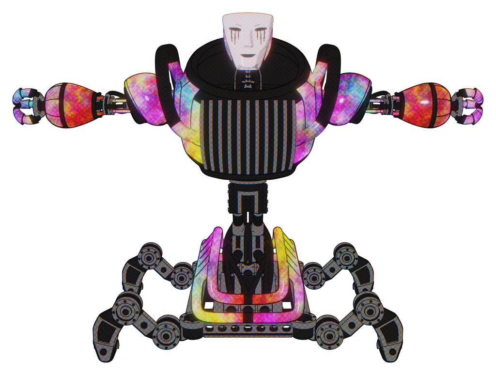 Robot containing humanoid face mask and blood tears and heavy upper chest and chest vents and insect walker legs. Plasma burst. T-pose.