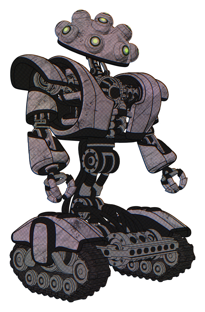 Bot containing techno multi-eyed domehead design and heavy upper chest and heavy mech chest and tank tracks. Sketch fast lines. Facing left view.