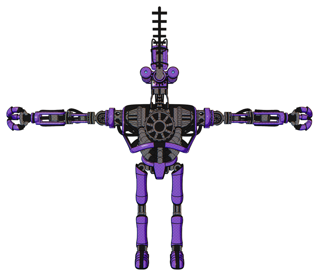Robot containing dual retro camera head and wireless internet transmitter head and heavy upper chest and no chest plating and ultralight foot exosuit. Secondary purple halftone. T-pose.