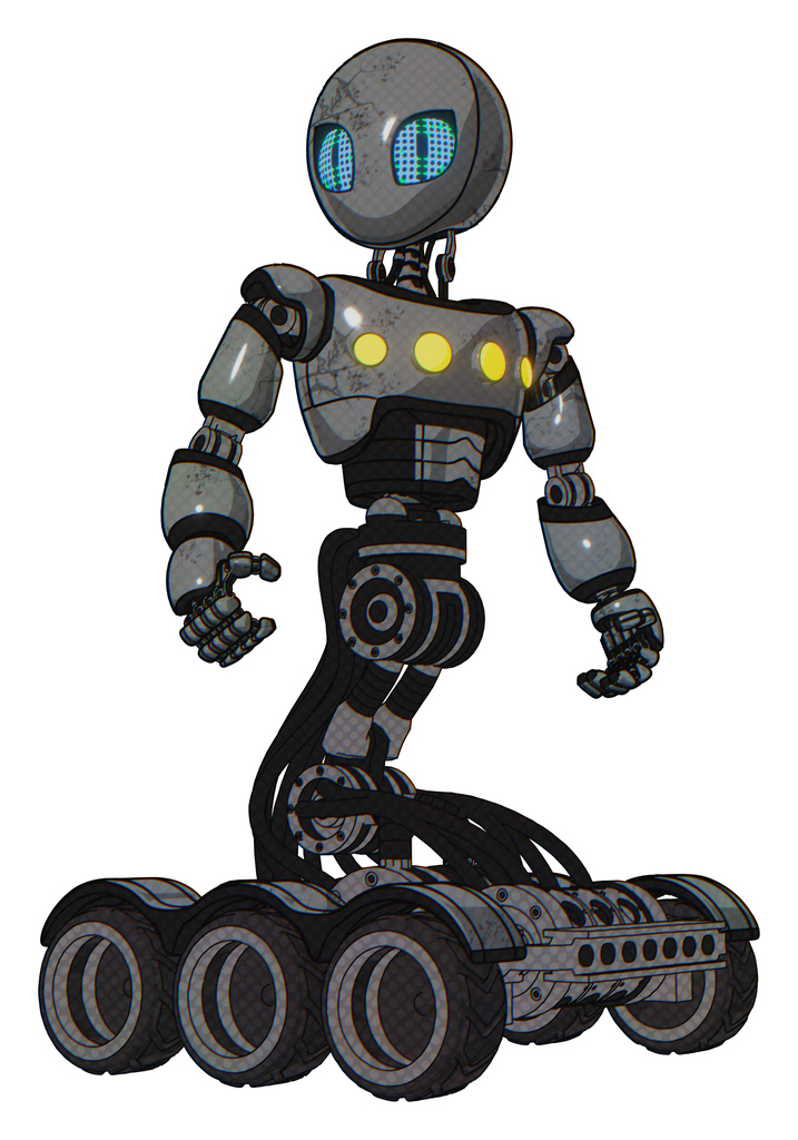 Robot containing grey alien style head and blue grate eyes and light chest exoshielding and yellow chest lights and six-wheeler base. Patent concrete gray metal. Hero pose.