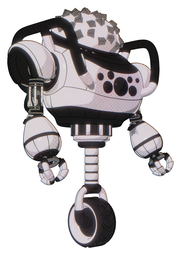 Mech containing metal cubes dome head design and heavy upper chest and chest compound eyes and unicycle wheel. White halftone toon. Facing left view.