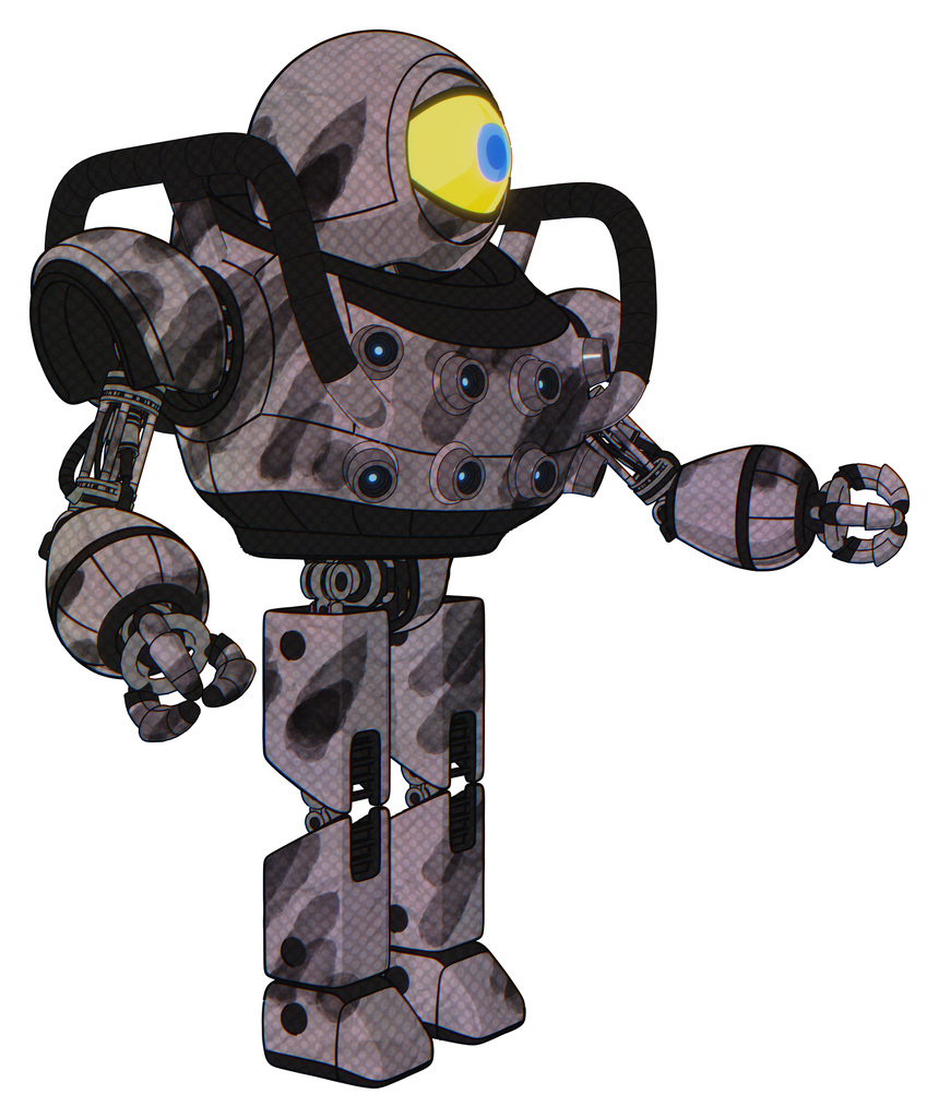 Mech containing giant eyeball head design and heavy upper chest and chest energy sockets and prototype exoplate legs. Sketch pad wet ink smudge. Interacting.