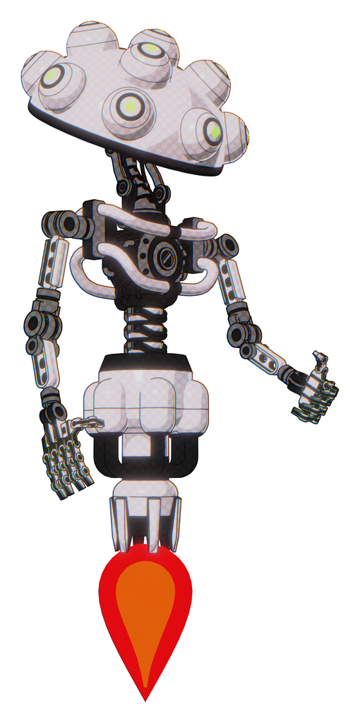 Droid containing techno multi-eyed domehead design and light chest exoshielding and no chest plating and jet propulsion. White halftone toon. Facing left view.