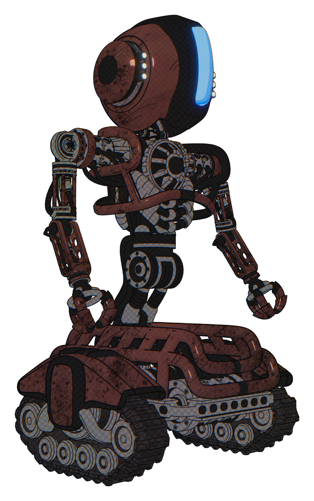 Automaton containing round head and large vertical visor and head light gadgets and heavy upper chest and no chest plating and tank tracks. Steampunk copper. Facing left view.