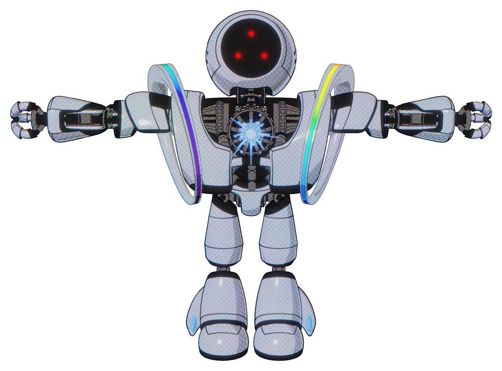 Automaton containing three led eyes round head and heavy upper chest and heavy mech chest and spectrum fusion core chest and light leg exoshielding. Blue tint toon. T-pose.