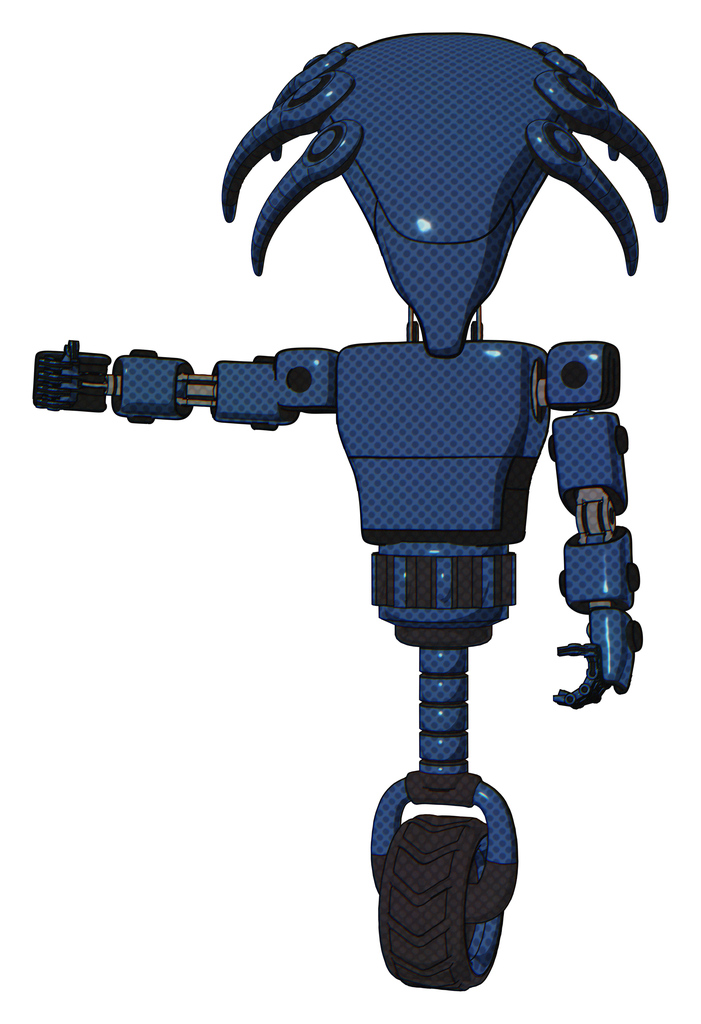Robot containing flat elongated skull head and light chest exoshielding and prototype exoplate chest and unicycle wheel. Dark blue halftone. Arm out holding invisible object..