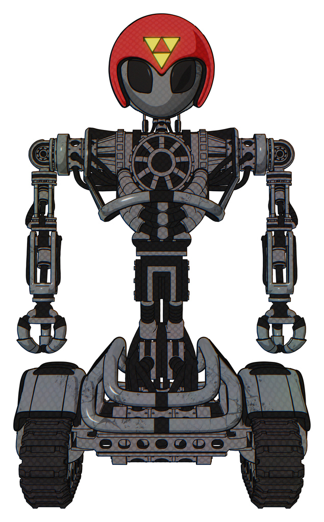 Mech containing grey alien style head and black eyes and triangle design and red helmet and heavy upper chest and no chest plating and tank tracks. Patent concrete gray metal. Front view.