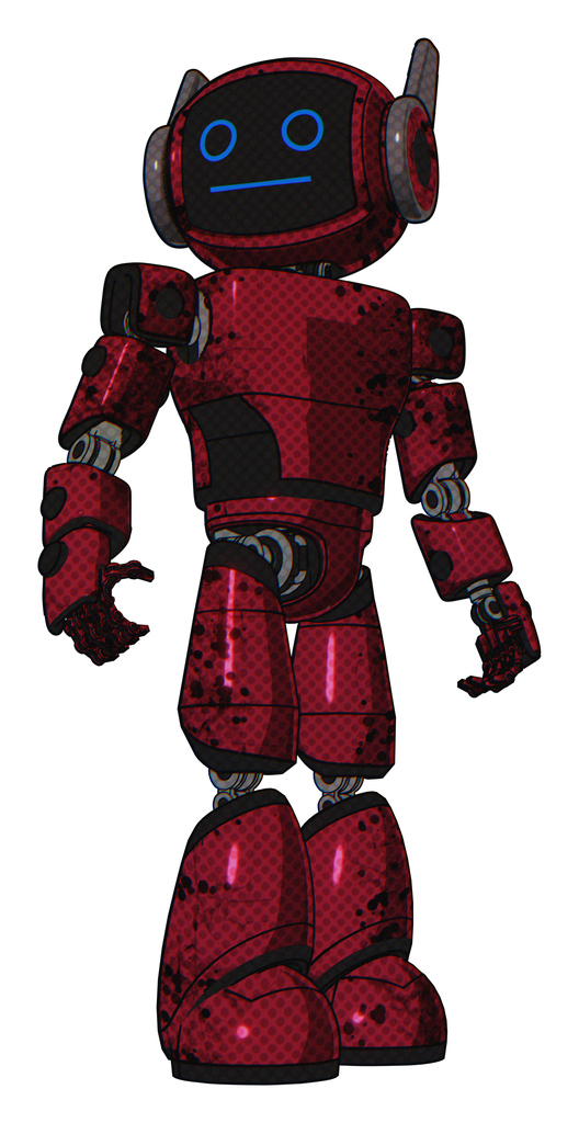 Droid containing digital display head and blank-faced expression and winglets and light chest exoshielding and prototype exoplate chest and light leg exoshielding. Grunge dots royal red. Hero pose.