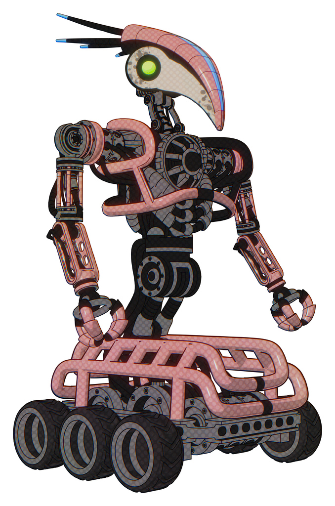 Mech containing bird skull head and green eyes and head shield design and heavy upper chest and no chest plating and six-wheeler base. Toon pink tint. Facing left view.