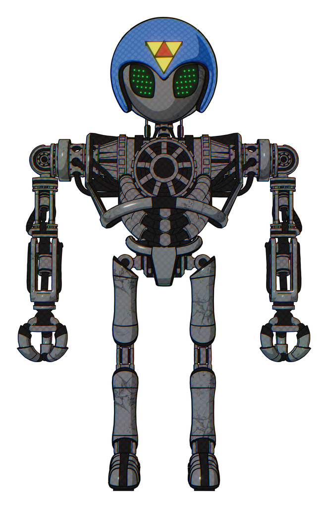Robot containing grey alien style head and led array eyes and triangle design and blue helmet and heavy upper chest and no chest plating and ultralight foot exosuit. Patent concrete gray metal.