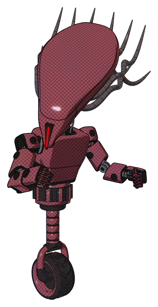 Robot containing flat elongated skull head and cables and light chest exoshielding and prototype exoplate chest and unicycle wheel. Muavewood halftone. Fight or defense pose..