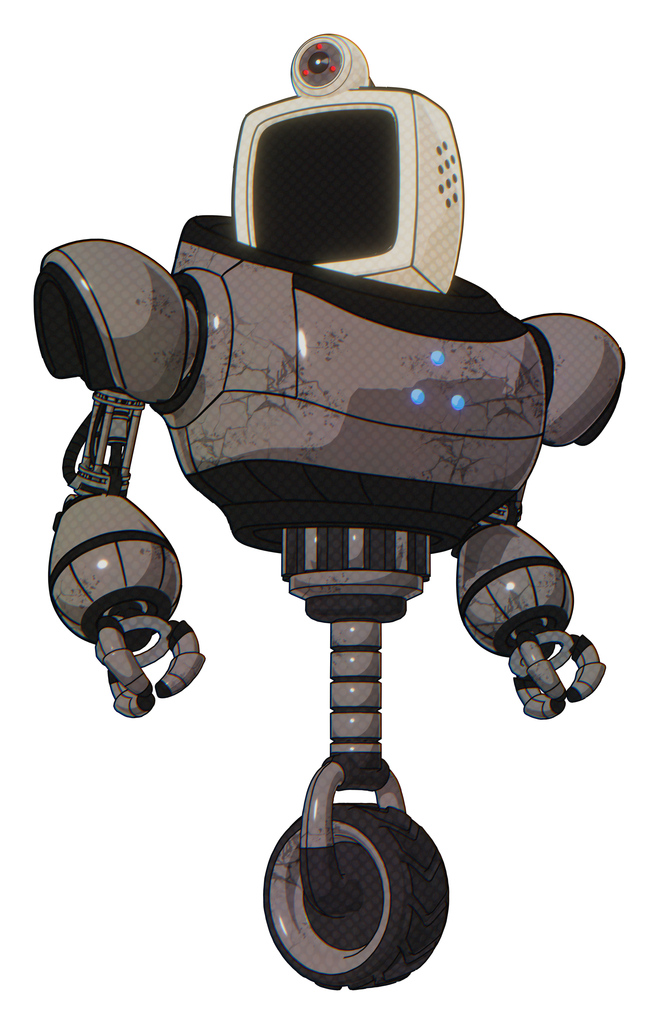 Droid containing old computer monitor and retro-futuristic webcam and heavy upper chest and triangle of blue leds and unicycle wheel. Light pink beige. Hero pose.