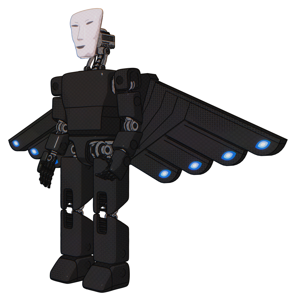 Robot containing humanoid face mask and light chest exoshielding and prototype exoplate chest and cherub wings design and prototype exoplate legs. Clean black. Facing right view.