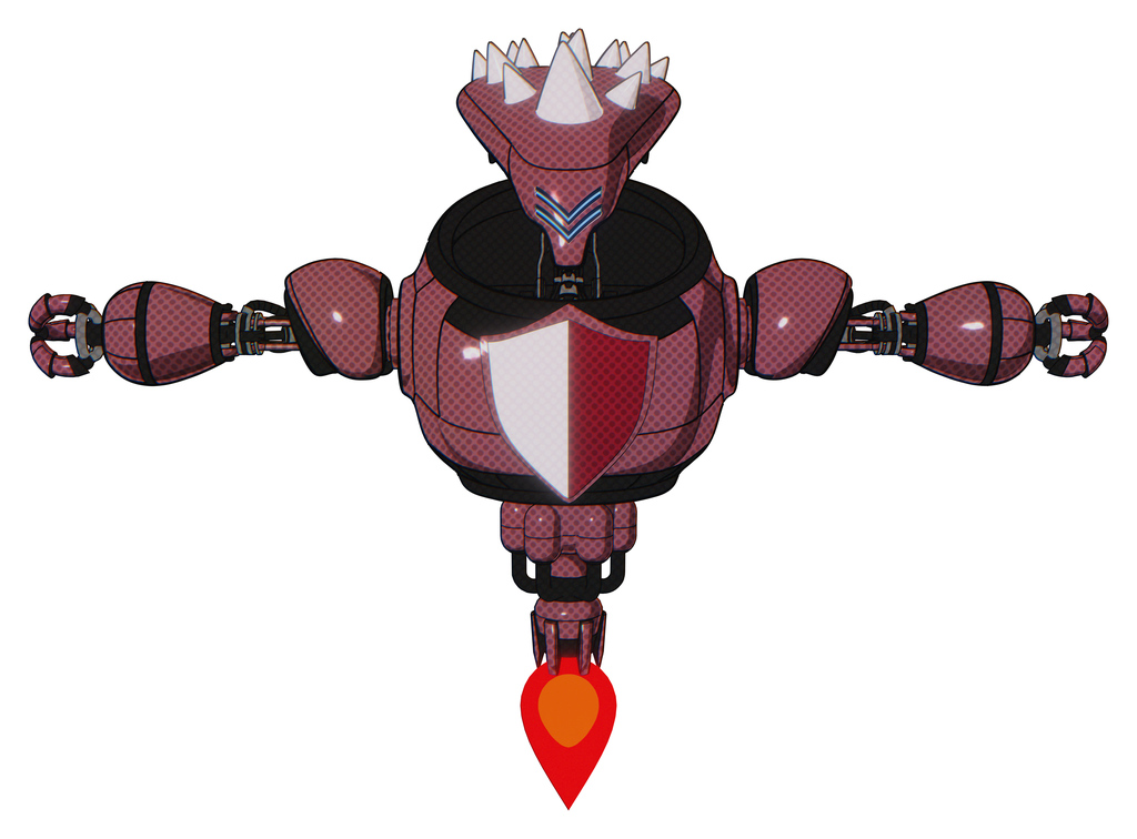 Robot containing flat elongated skull head and spikes, and heavy upper chest and red shield defense design and jet propulsion. Muavewood halftone. T-pose.