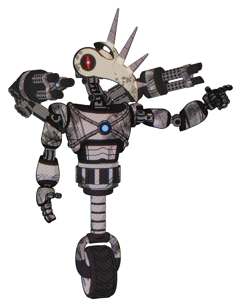 Bot containing bird skull head and red line eyes and light chest exoshielding and blue energy core and minigun back assembly and unicycle wheel. Scribble sketch. Pointing left or pushing a button..