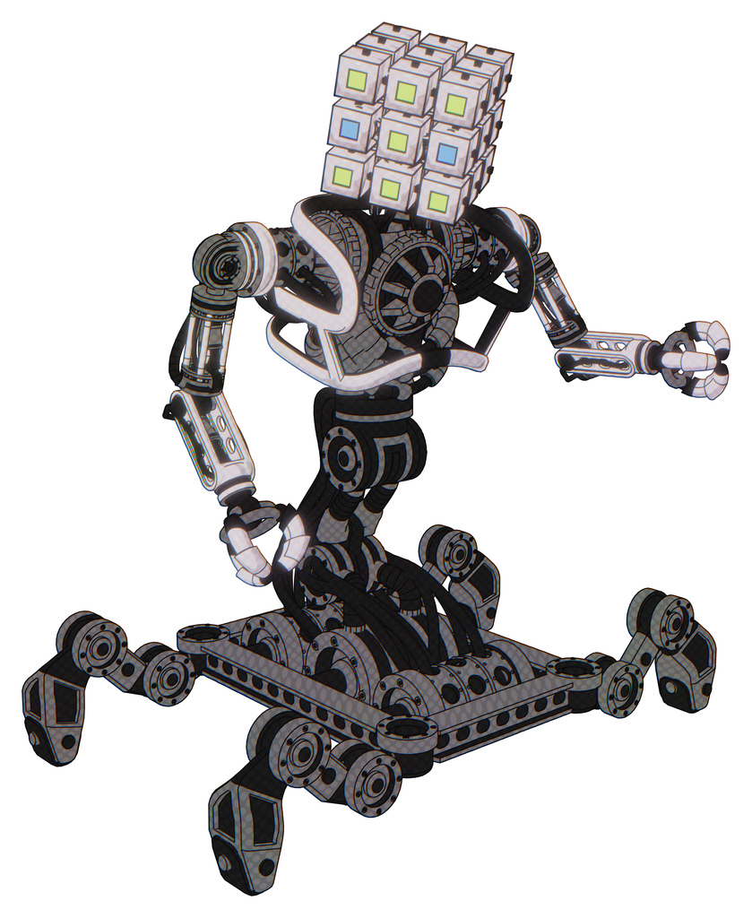 Cyborg containing dual retro camera head and cube array head and heavy upper chest and no chest plating and insect walker legs. White halftone toon. Fight or defense pose..