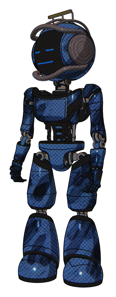 Mech containing digital display head and sleeping face and led and protection bars and light chest exoshielding and ultralight chest exosuit and light leg exoshielding. Grunge dark blue.