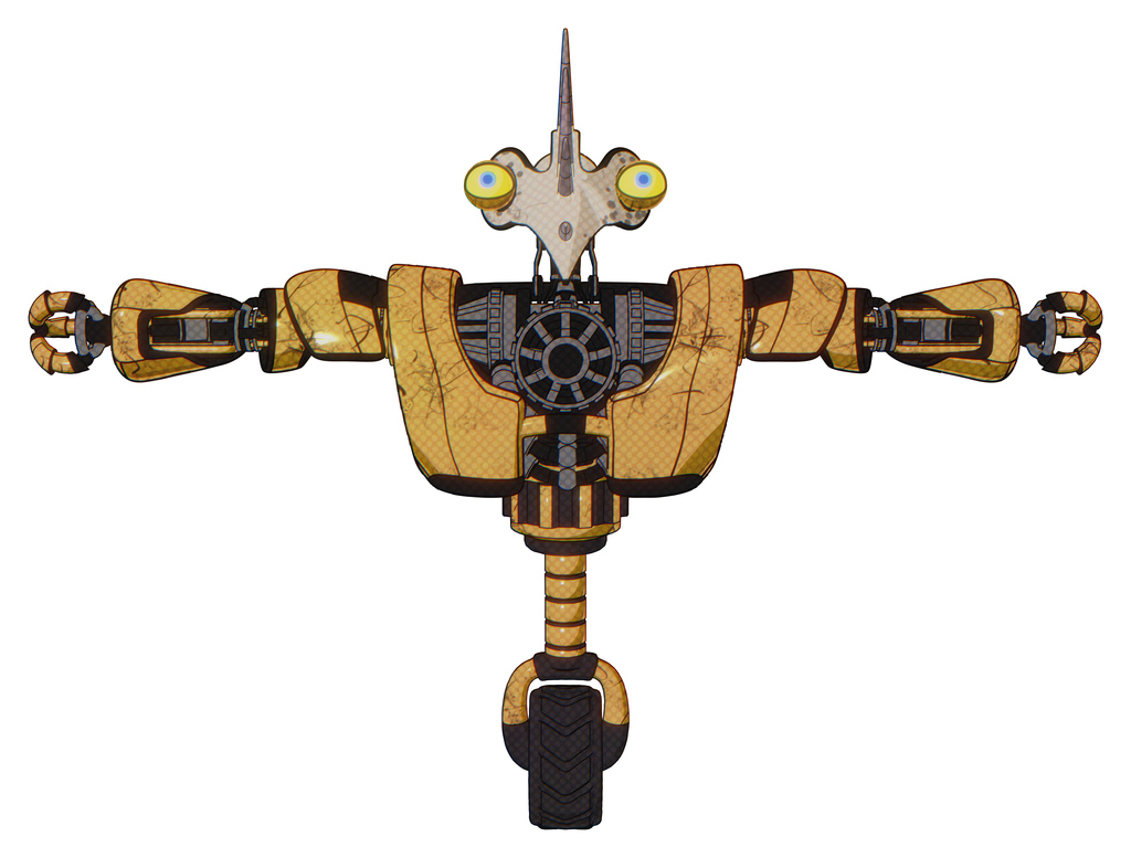 Bot containing bird skull head and big yellow eyes and heavy upper chest and heavy mech chest and unicycle wheel. Construction yellow halftone. T-pose.