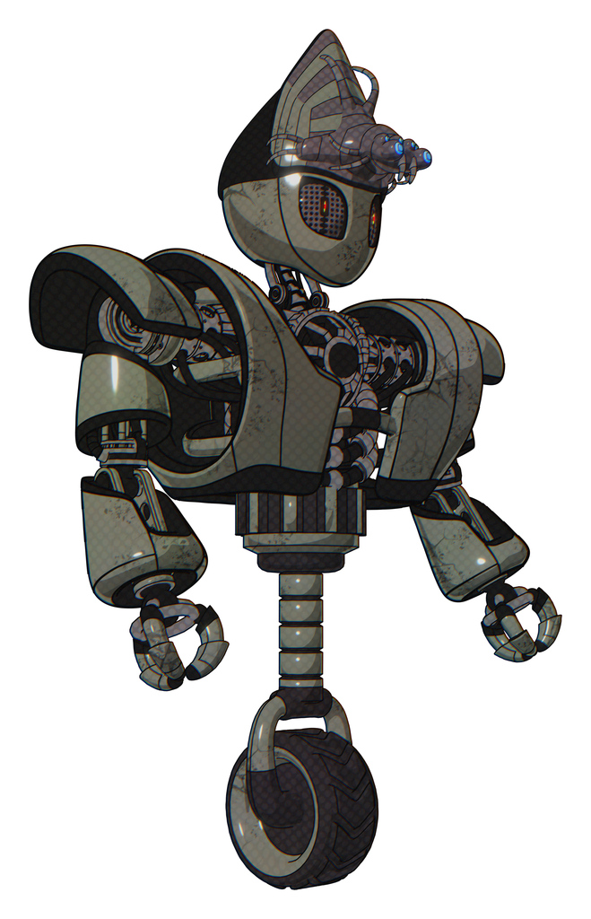 Droid containing grey alien style head and metal grate eyes and alien bug creature hat and heavy upper chest and heavy mech chest and unicycle wheel. Concrete grey metal. Facing left view.