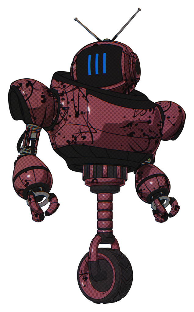 Bot containing digital display head and three vertical line design and retro antennas and heavy upper chest and unicycle wheel. Muavewood halftone grunge. Hero pose.