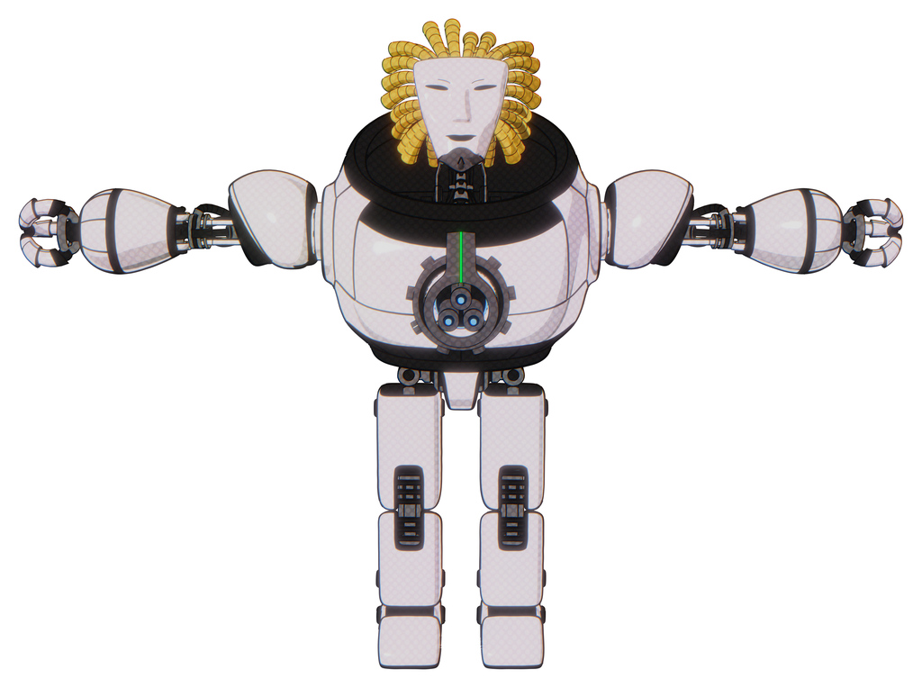 Droid containing humanoid face mask and heavy upper chest and chest energy gun and prototype exoplate legs. White halftone toon. T-pose.