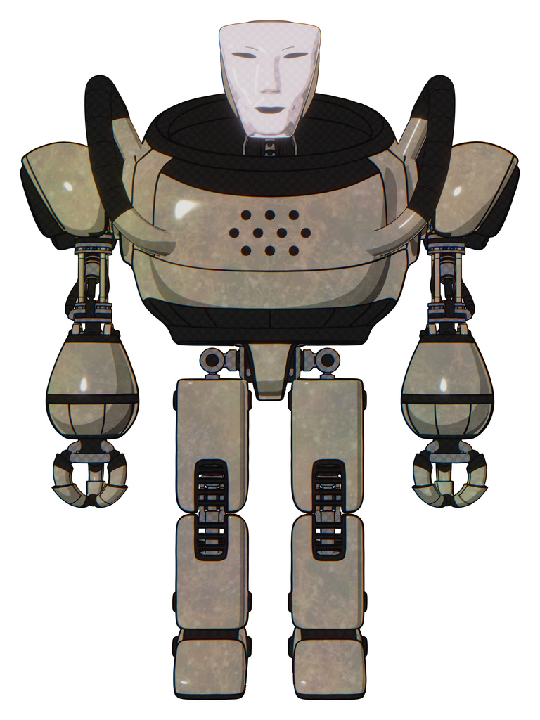 Droid containing humanoid face mask and heavy upper chest and prototype exoplate legs. Grungy fiberglass. Front view.