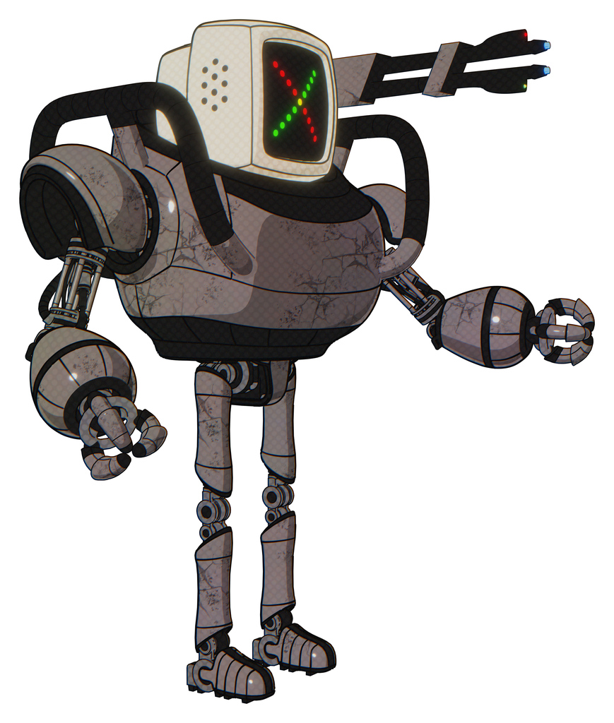 Mech containing old computer monitor and colored x display and heavy upper chest and ultralight foot exosuit. Light pink beige. Interacting.